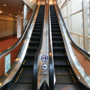 自动扶梯由梯路(变型的板式输送机)和两旁的扶手(变形的带式输送机)组成。其主要部件有梯级、牵引链条及链轮、导轨系统、主传动系统(包括电动机、减速装置、制动器及中间传动环节等)、驱动主轴、梯路张紧装置、扶手系统、梳板、扶梯骨架和电气系统等。梯级在乘客入口处作水平运动(方便乘客登梯),以后逐渐形成阶梯;在接近出口处阶梯逐渐消失,梯级再度作水平运动。这些运动都是由梯级主轮、辅轮分别沿不同的梯级导轨行走来实现的。